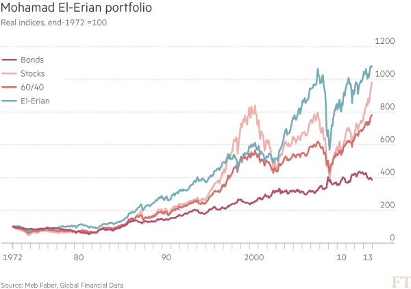 De portefeuille van “El-Erian” zat 51 procent in aandelen, 17 procent in individuele obligaties, en de rest verdeeld tussen geïndexeerde obligaties, grondstoffen en vastgoed.