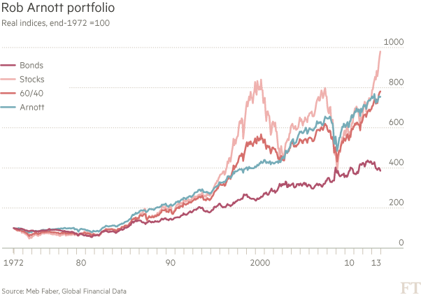 Zijn portfolio had 20 procent aandelen, 20 procent bedrijfsobligaties, 30 procent staatsobligaties, 10 procent aan de inflatie gekoppelde obligaties en 10 procent in grondstoffen en vastgoed. Deze samenstelling had een rendement van 5,04 procent en een maximale drawdown van 26 procent.