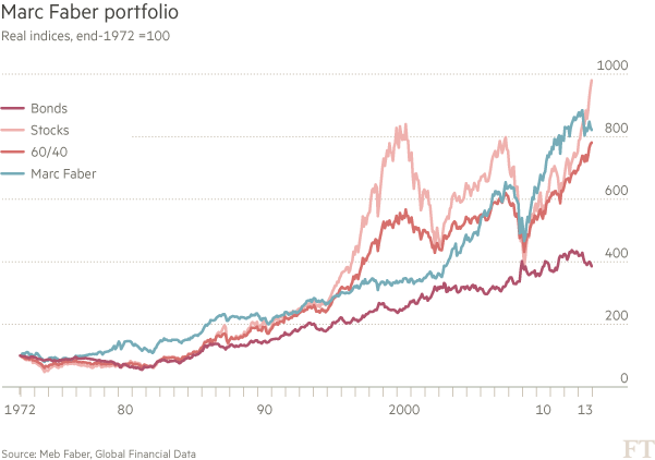 De Marc Faber portfolio, genoemd naar de beroemde blogger, zat 25 procent in verschillende aandelen, obligaties, goud en onroerend goed.