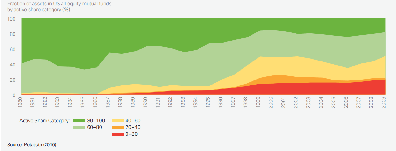 Helaas zien we over een lange periode dat het aantal beleggingsfondsen met een percentage dat meer dan 80% afwijkt van de index steeds verder afnemen, waardoor er in de praktijk in steeds minder gevallen een outperformance zal worden geleverd.