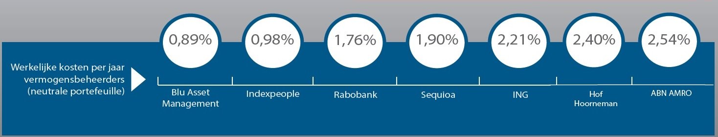 Bij banken lopen de totale kosten, dus inclusief beheerfee, transactiekosten, bewaarloon en etf/ beleggingsfondskosten al uiteen van 1,8% tot 2,54% per jaar, terwijl de kosten van zelfstandig vermogensbeheerders uiteenlopen van 0,89% (BLU Asset Management) tot 2,4% per jaar bij Hof Hoorneman. De laatst genoemde is een vermogensbeheerder met een bankvergunning.