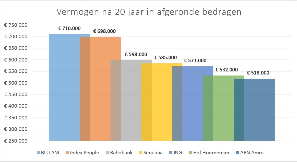Onderstaand zie je een overzicht van het eindvermogen bij banken/vermogensbeheerders na 20 jaar bij een inleg van € 250.000. De kosten zijn inclusief beheerfee, bewaarloon, transactiekosten en fondskosten, zoals vermeld in figuur 1.
