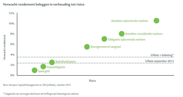 Over die 4% betaal je 30% belasting, hetgeen resulteert in een vermogensrendementsheffing van 1,2%. Tel daar de inflatie bij op en je weet zeker dat je achteruit spaart. Beleggen is een alternatief. Maar weegt een hoger rendement wel op tegen het risico dat je loopt?