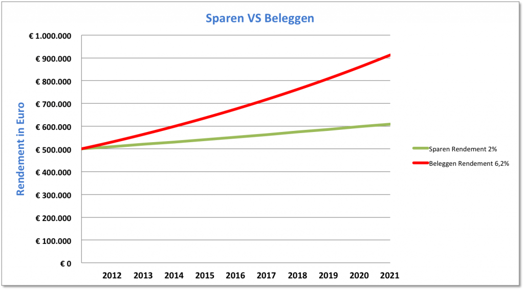 In dit artikel proberen we onze visie daar op te geven, uiteraard onderbouwd met een aantal belangrijke cijfers. Zie hieronder het verschil tussen sparen en beleggen. De invloed op de ontwikkeling van het vermogen is enorm.
