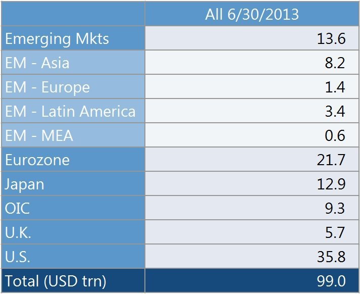 Op onderstaande afbeelding vindt u de verdeling van de obligatiemarkt in US Dollars.Deze markt is met ca. 30% gestegen vanaf 2007 t/m 2013. De aandelenmarkt heeft een omvang van 53.8 triljoen US Dollars. Deze markt is juist iets gekrompen.