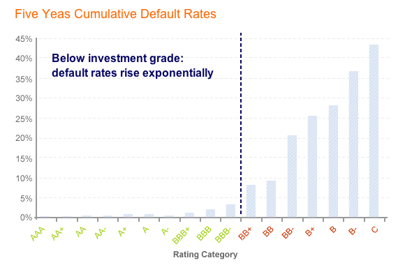 Net zoals met alles dat een hoger rendement oplevert, brengt het ook meer risico’s met zich mee. Als er voor obligaties met een lagere waardering gekozen wordt is de kans aanzienlijk groter dat de uitgevende bedrijven/ landen in de financiële problemen komen of zelfs failliet gaan. Hieronder ziet u een duidelijk verband tussen een lagere kredietwaardering en het toenemend aantal faillissementen.