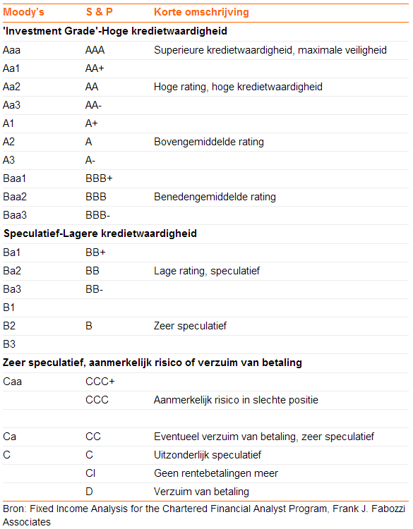 Daarbij is het belangrijk om de kredietwaardigheid in acht te nemen van het bedrijf waarvan u een obligatie aankoopt om de kans op een mogelijk faillissement te beoordelen. De bekendste kredietbeoordelaars welke deze beoordelingen geven aan een bedrijf zijn: Fitch Ratings, Moody’s en Standard & Poor’s.
