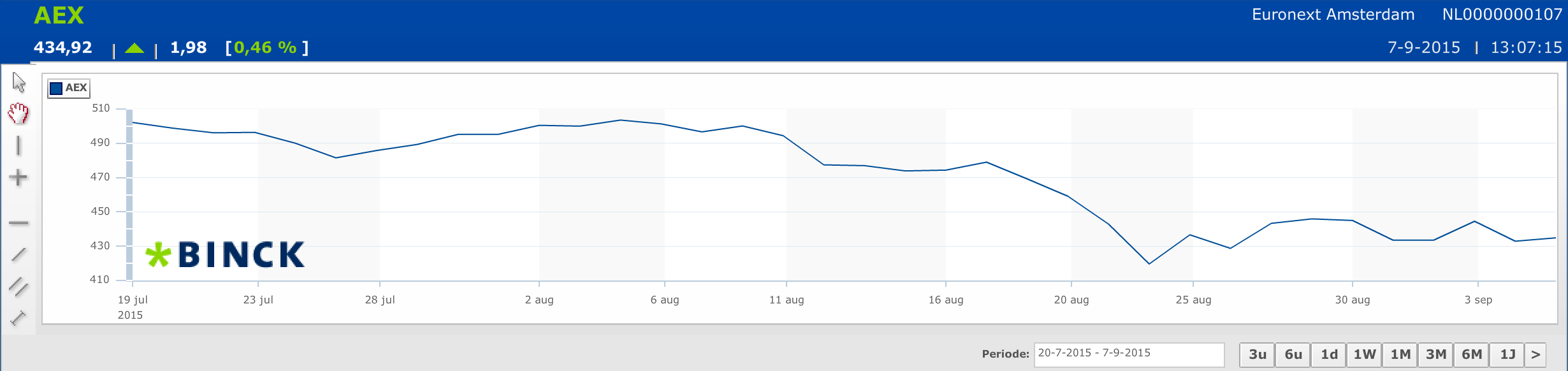 De economische ontwikkelingen in China hebben de beurzen flink in beweging gebracht de afgelopen maanden. Zo stond onze eigen AEX op 20 juli nog boven de 500 punten. Inmiddels staat deze index alweer op 435 punten, een daling van zo’n 13% in anderhalve maand tijd! Om het hoogste niveau van dit jaar te bereiken zal de AEX maar liefst met 15% moeten stijgen.